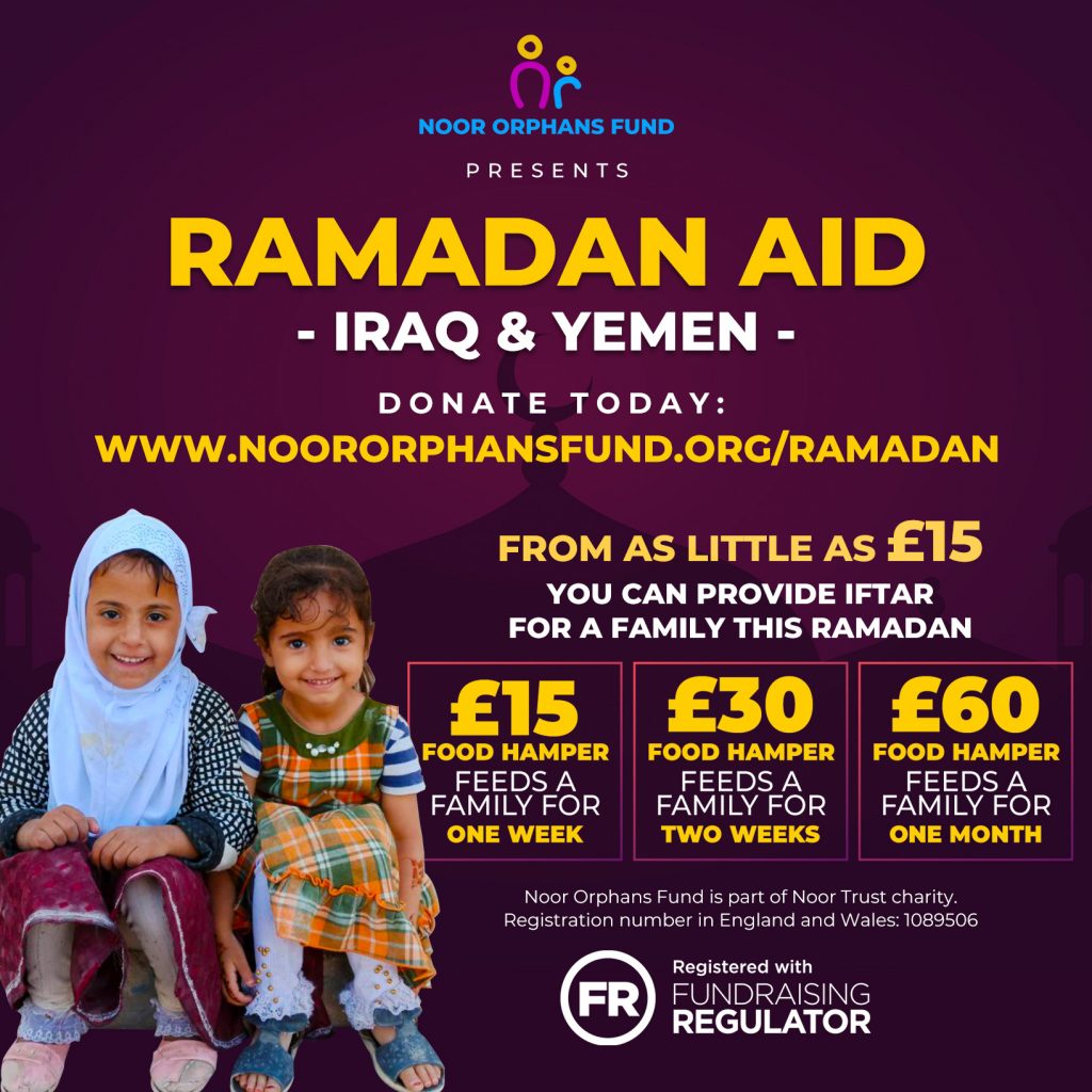 At Noor Orphans Fund, our charity is continually seeking to provide better living conditions and educational opportunities to orphans and widows and provide a brighter future for their families. We need your help for our ongoing campaigns to be able to provide financial and practical support. Your donations will support the neediest orphans and widows. Noor Orphans Fund will be distributing food packs throughout the holy month of Ramadan as part of our Ramadan Aid campaign.